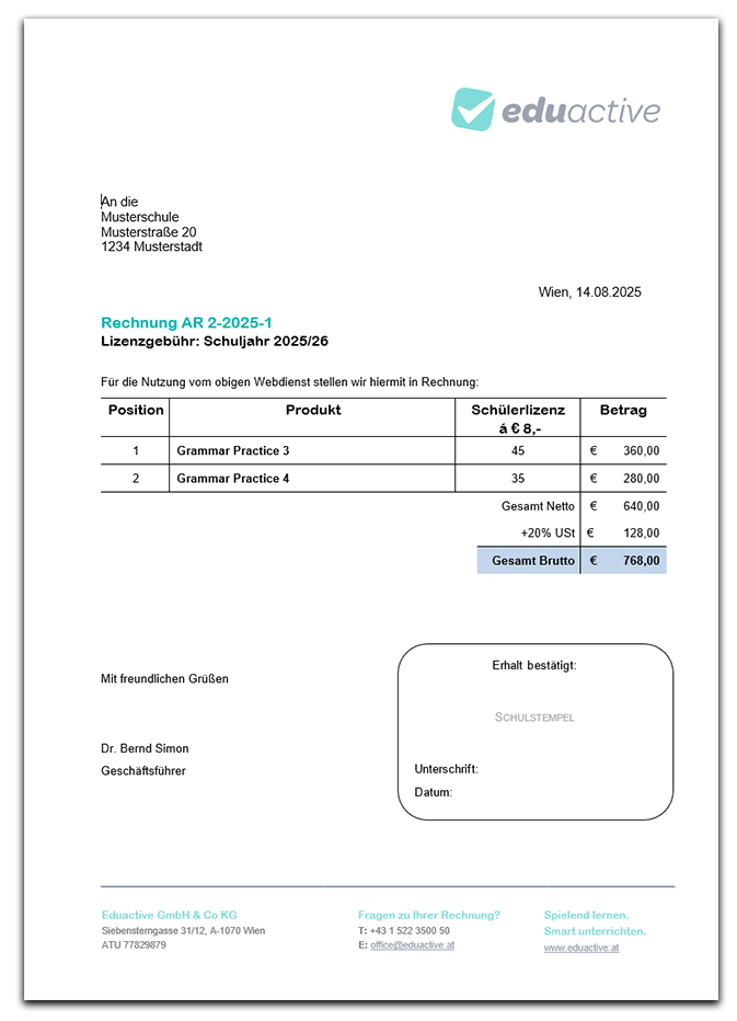 Wichtige Information zur e-Rechnung:Öffentliche Schulen in Österreich sind gesetzlich verpflichtet, Rechnungen elektronisch über das Portal des Bundes (e-rechnung.gv.at) zu empfangen. Unsere Rechnungen werden im standardisierten Format erstellt und sind somit zu 100 % konform mit den Vorgaben des Bundes. Die Schule kann unsere Rechnung dann direkt über ihr Budget für Unterrichtsmittel eigener Wahl begleichen.